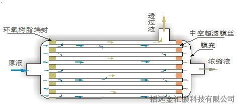2、外壓式:外壓式中空纖維超濾膜則是原液經(jīng)壓力差沿徑向由外向內(nèi)滲透過中空纖維成為透過液,而截留的物質(zhì)則匯集在中空纖維的外部。其流向見圖三所示: