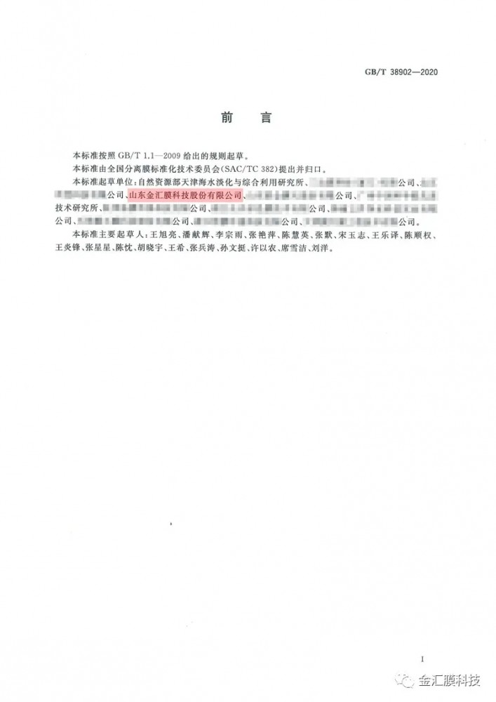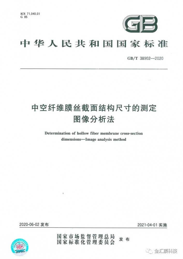 山東金匯膜科技股份有限公司參與起草編寫了國家標(biāo)準(zhǔn):《中空纖維膜絲截面結(jié)構(gòu)尺寸的測定圖像分析法》、 《中空纖維膜耐化學(xué)清洗劑腐蝕性能評價方法》2項,現(xiàn)已發(fā)布。