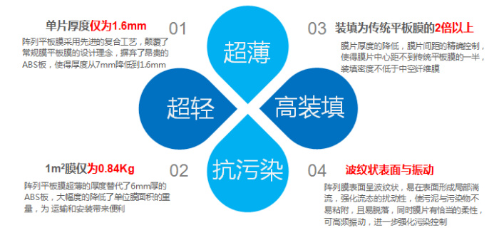 (3)獨特的片狀結(jié)構(gòu),保證上下氣通道順暢,無毛發(fā)纖維纏繞問題;同時在曝氣 作用下,膜片會產(chǎn)生高頻振動,進一步減少污染的堆積;
