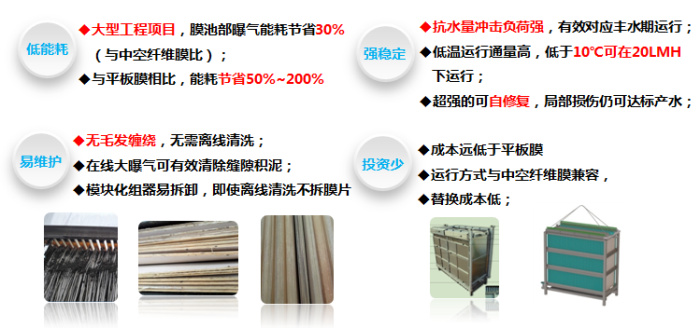 (2)組件結(jié)構(gòu)緊湊,裝填面積高,裝填比傳統(tǒng)平板膜提高 200%以上,能耗小于 傳統(tǒng)平板膜的 50%,甚至更低;